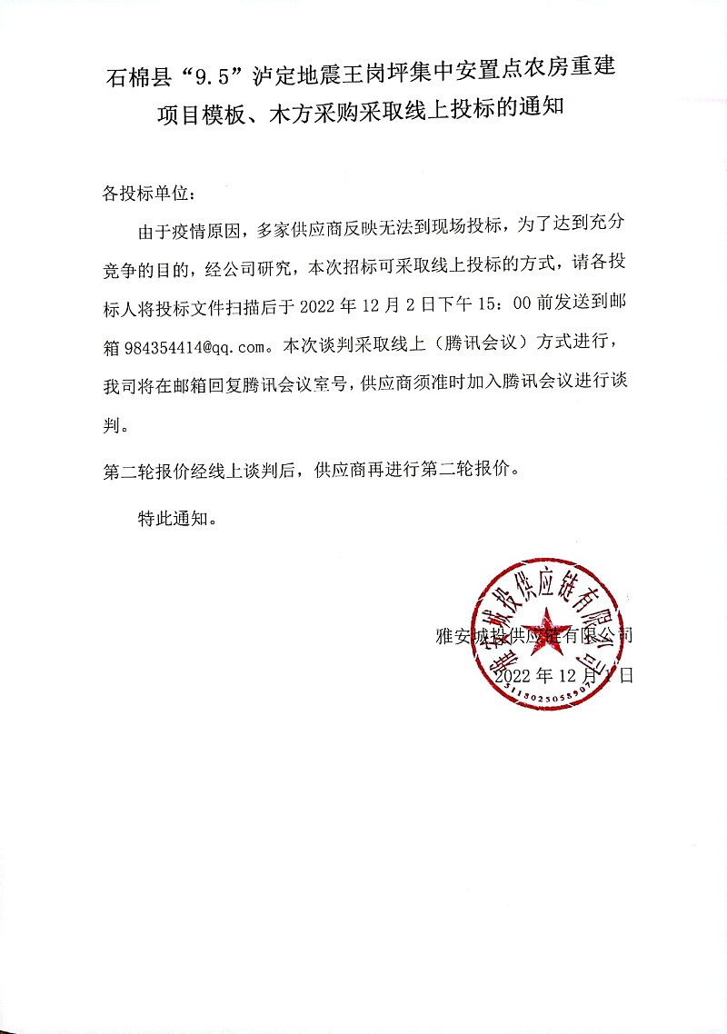 石棉縣“9.5”瀘定地震王崗坪集中安置點(diǎn)農(nóng)房重建項(xiàng)目模板、木方采購(gòu)線上投標(biāo)的通知