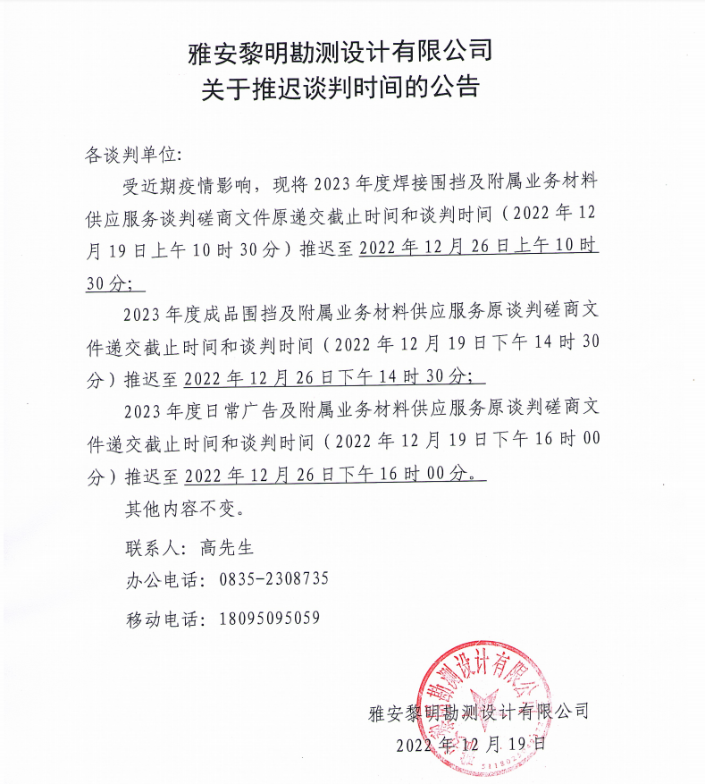雅安黎明勘測設(shè)計有限公司關(guān)于推遲談判時間的公告
