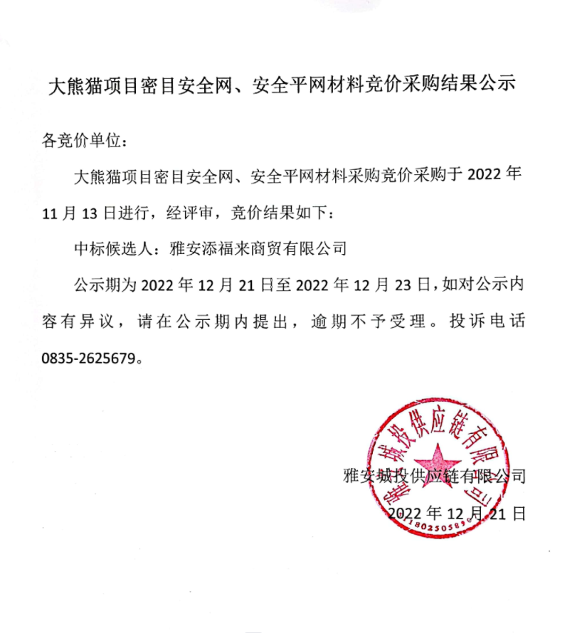 大熊貓項目密目安全網、安全平網材料競價采購結果公示