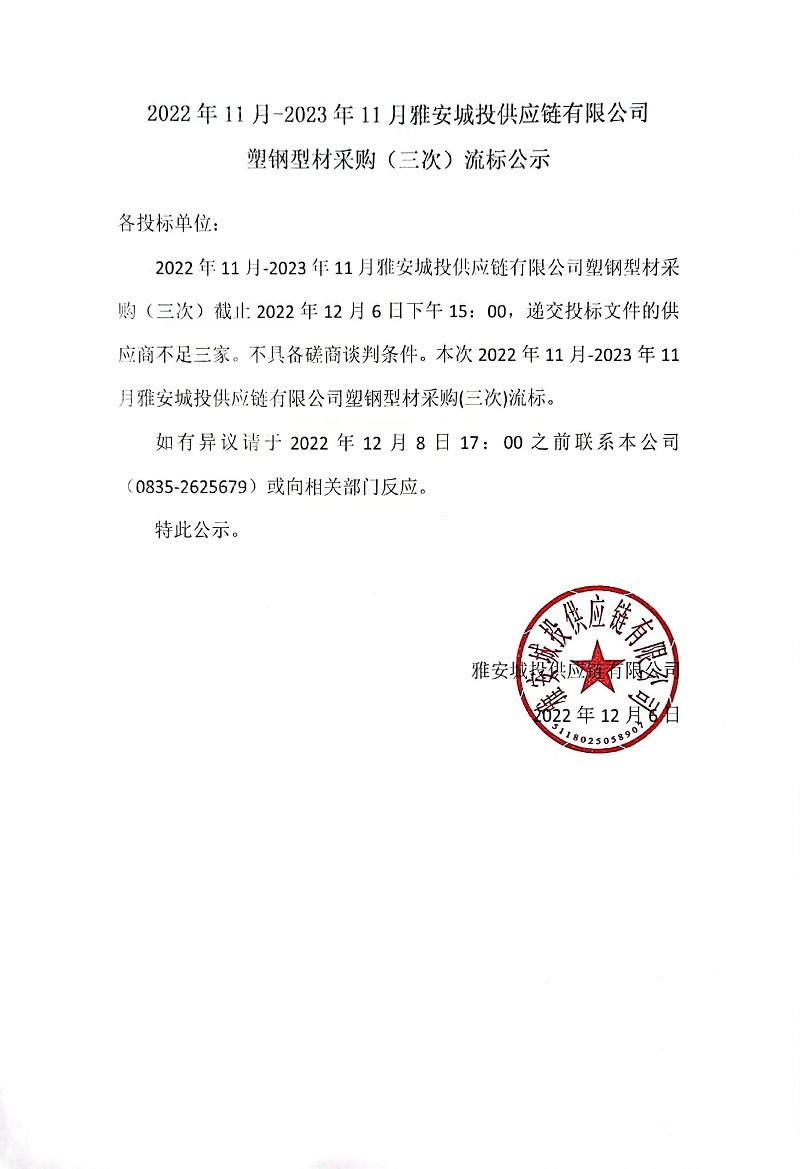 2022年11月-2023年11月雅安城投供應(yīng)鏈有限公司塑鋼型材采購(gòu)(三次)流標(biāo)公示