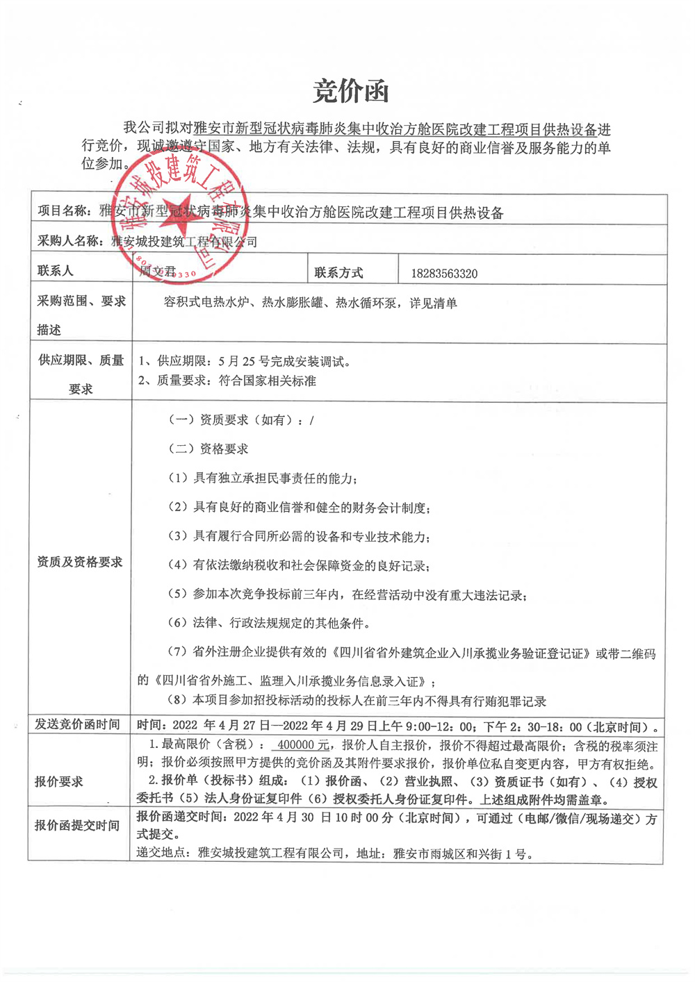 雅安市新型冠狀病毒肺炎集中收治方艙醫(yī)院改建工程項(xiàng)目供熱設(shè)備競價函