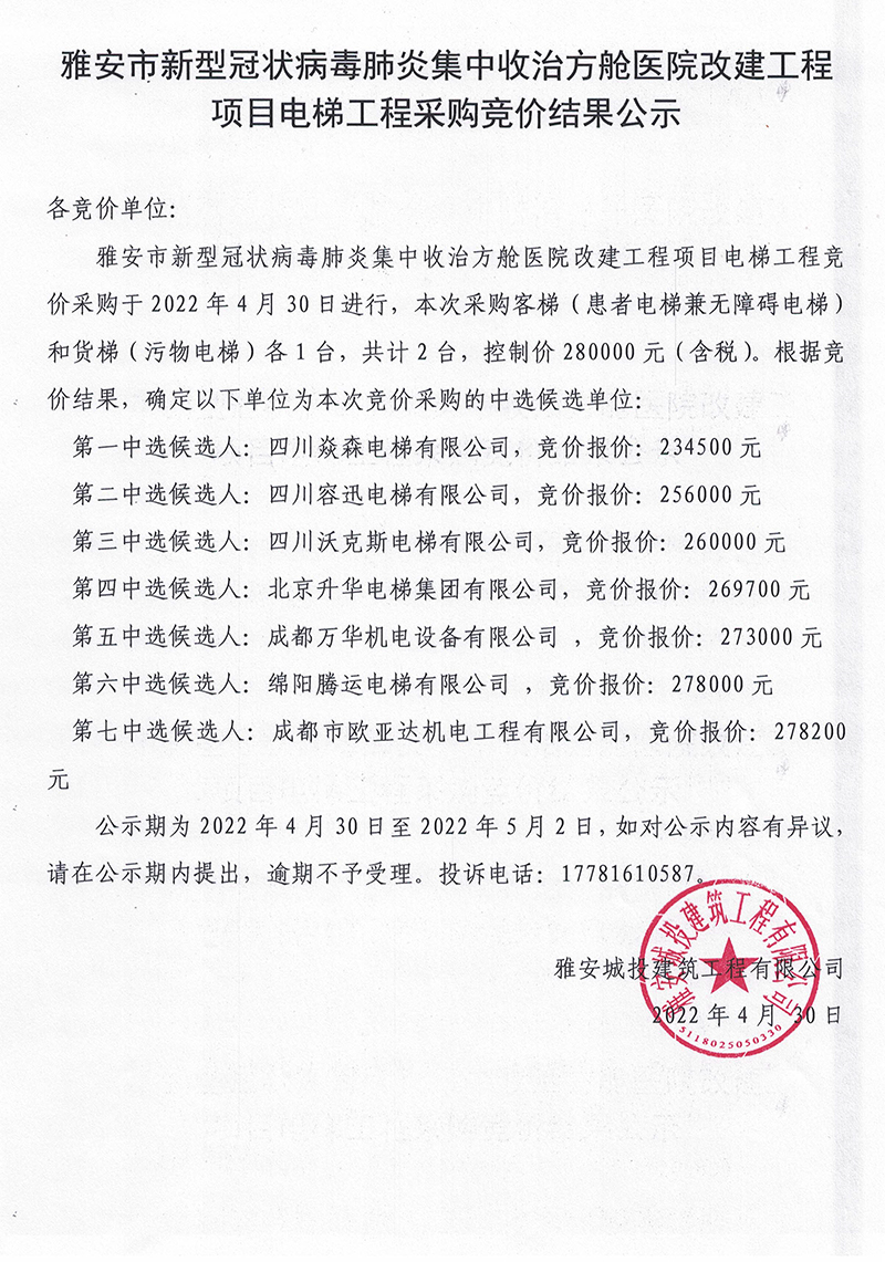 雅安市新型冠狀病毒肺炎集中收治方艙醫(yī)院改建工程項(xiàng)目電梯工程采購競(jìng)價(jià)結(jié)果公示