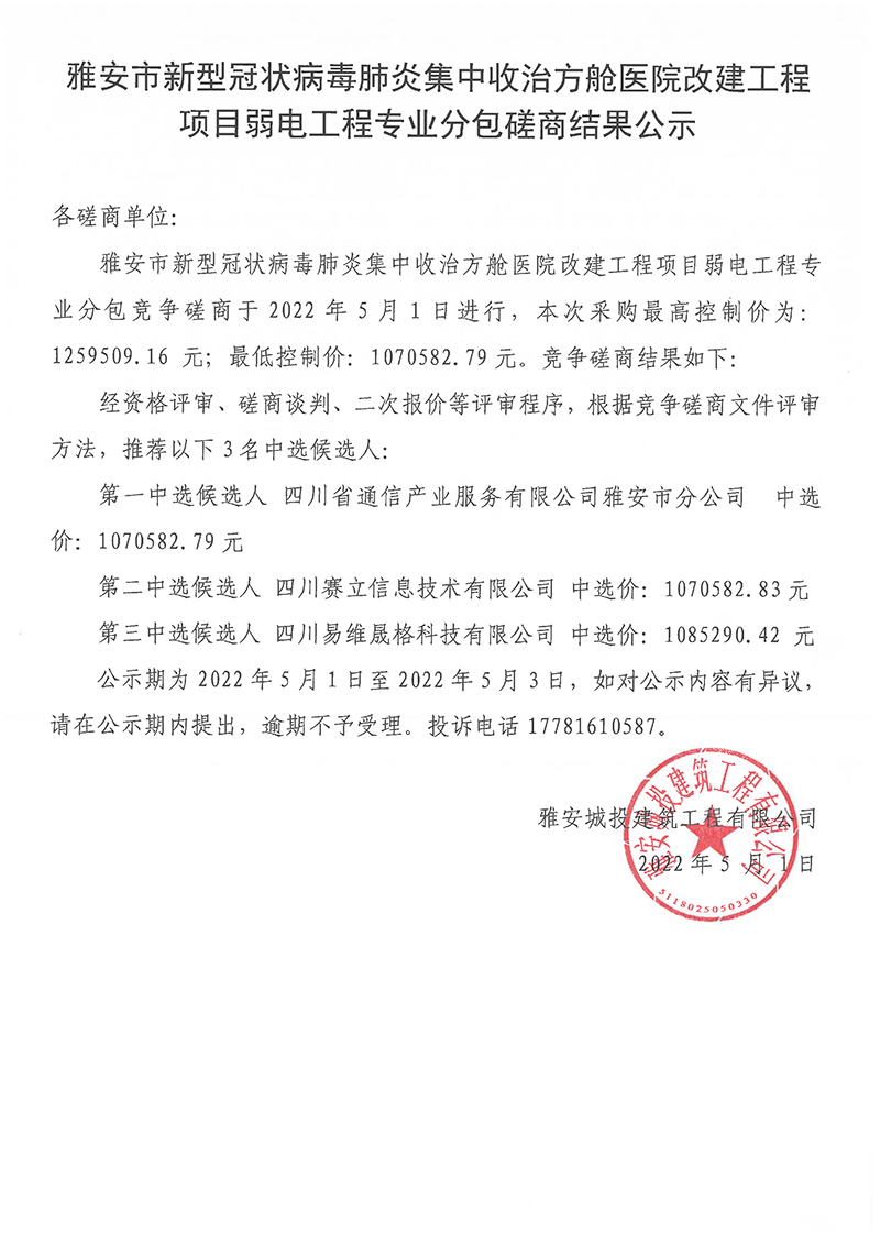 雅安市新型冠狀病毒肺炎集中收治方艙醫(yī)院改建工程項(xiàng)目弱電工程專業(yè)分包磋商結(jié)果公示