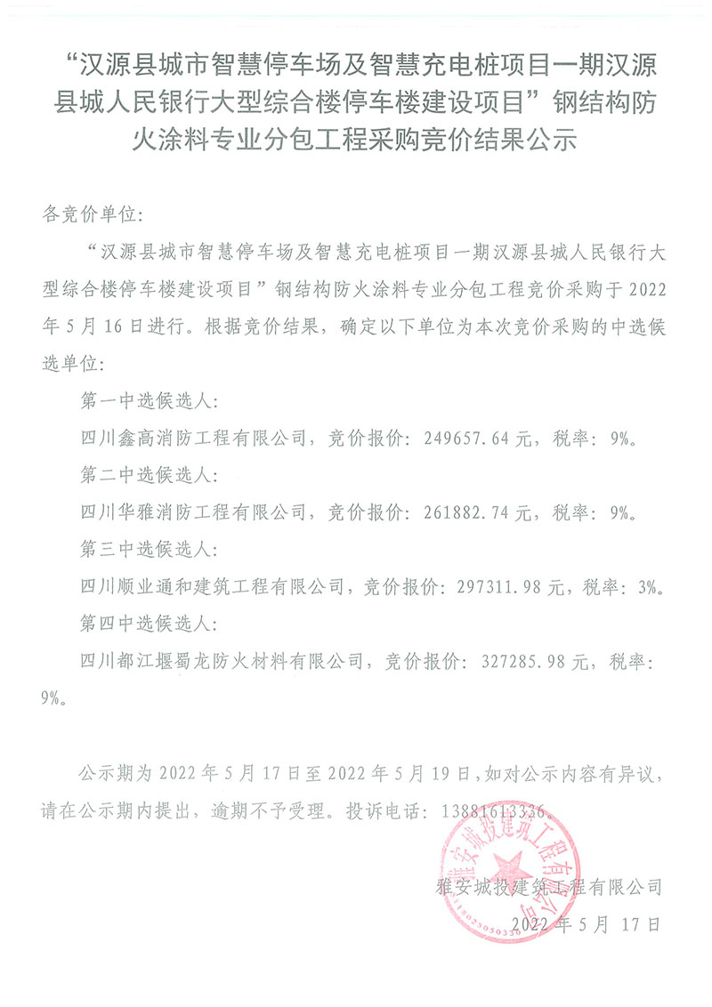 漢源縣城市智慧停車場及智慧充電樁項(xiàng)目一期漢源縣城人民銀行大型綜合樓停車樓建設(shè)項(xiàng)目防火涂料專業(yè)分包工程采購競價結(jié)果公示