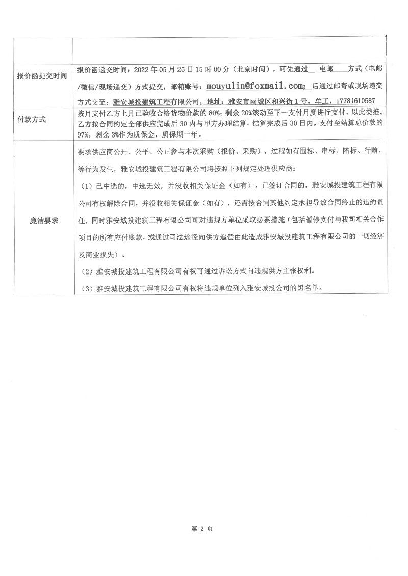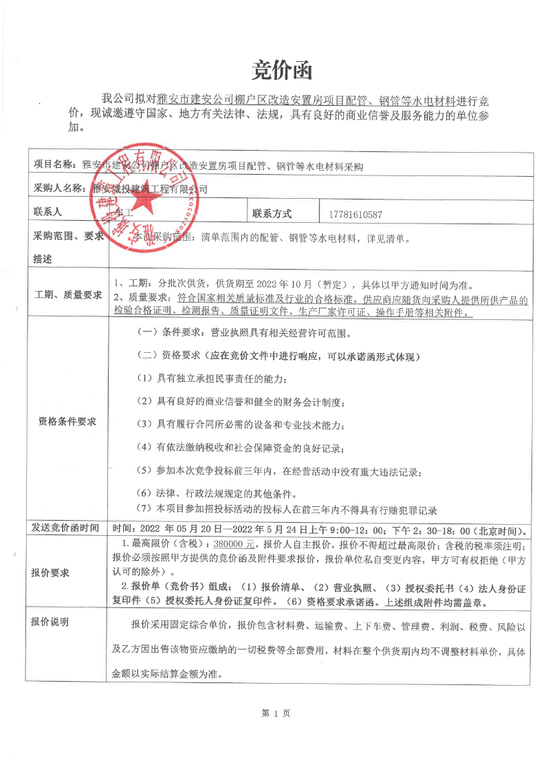 雅安市建安公司棚戶區(qū)改造安置房項(xiàng)目配管、鋼管等水電材料競(jìng)價(jià)函