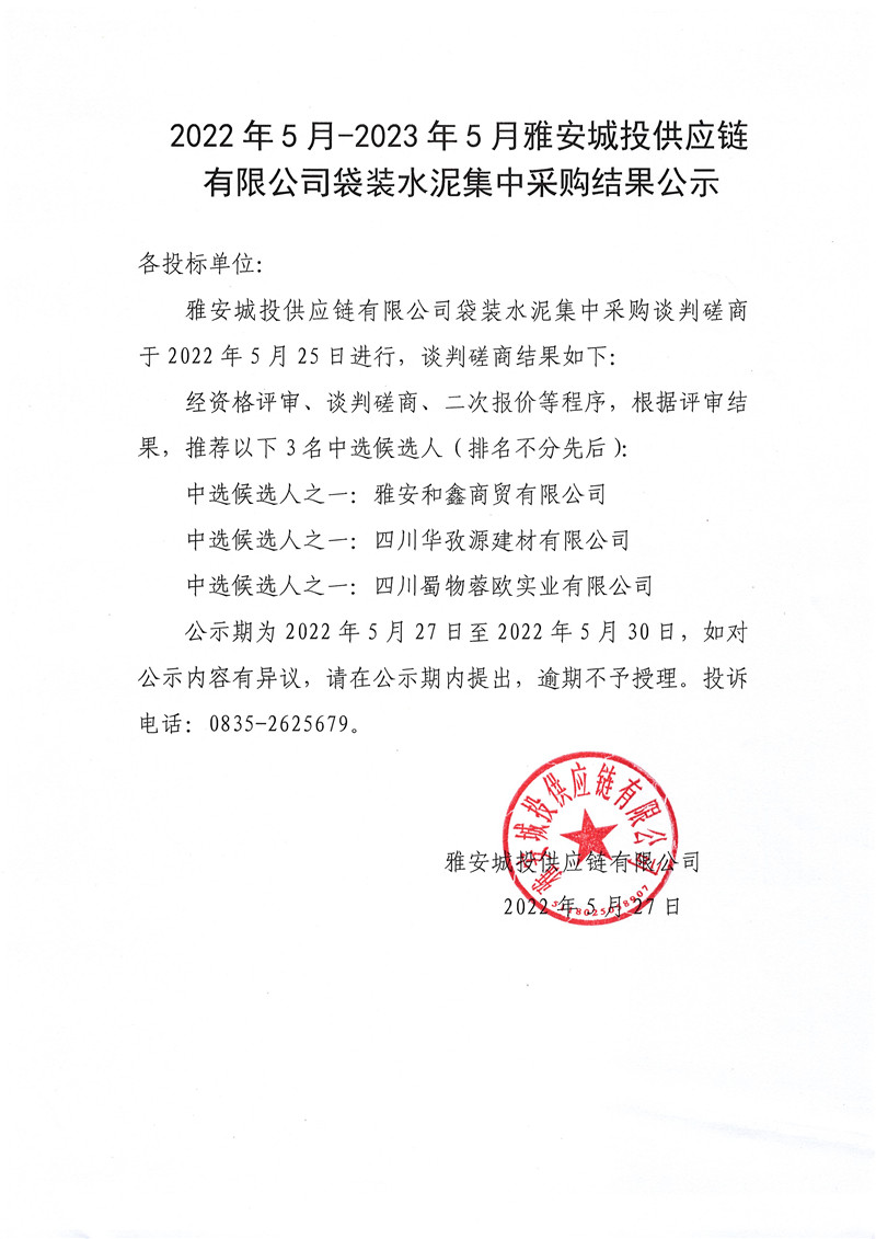 2022年5月-2023年5月雅安城投供應(yīng)鏈有限公司袋裝水泥集中采購(gòu)結(jié)果公示