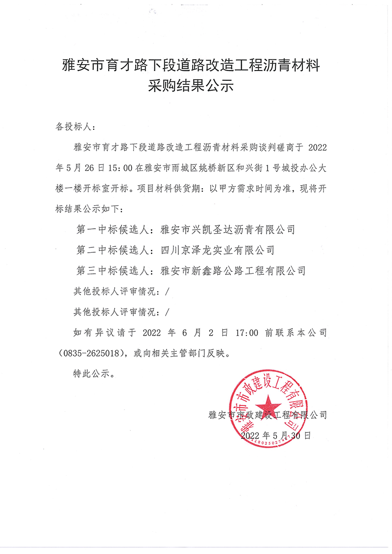 雅安市育才路下段道路改造工程瀝青材料采購結果公示