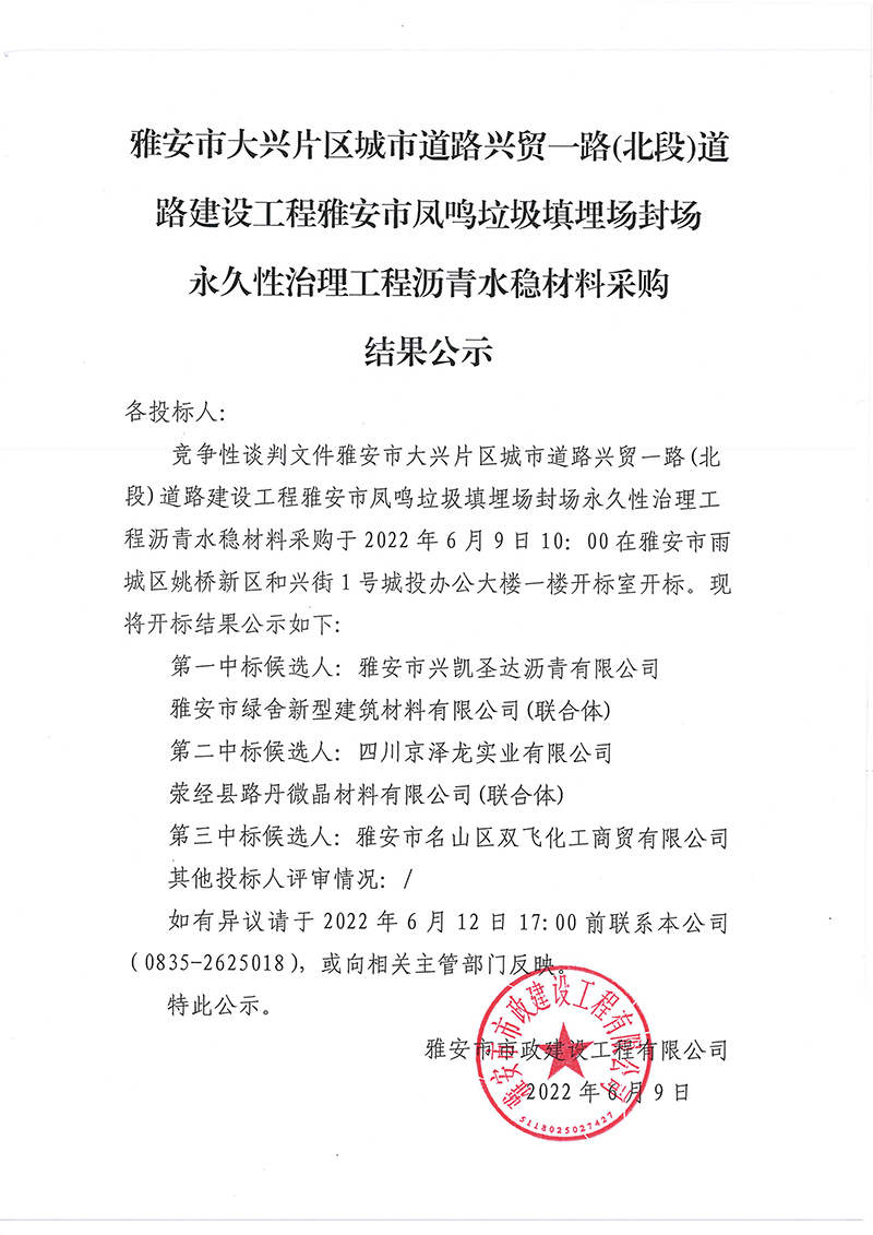 雅安市大興片區(qū)城市道路興貿(mào)一路(北段)道路建設(shè)工程雅安市鳳鳴垃圾填埋場封場永久性治理工程瀝青水穩(wěn)材料采購結(jié)果公示