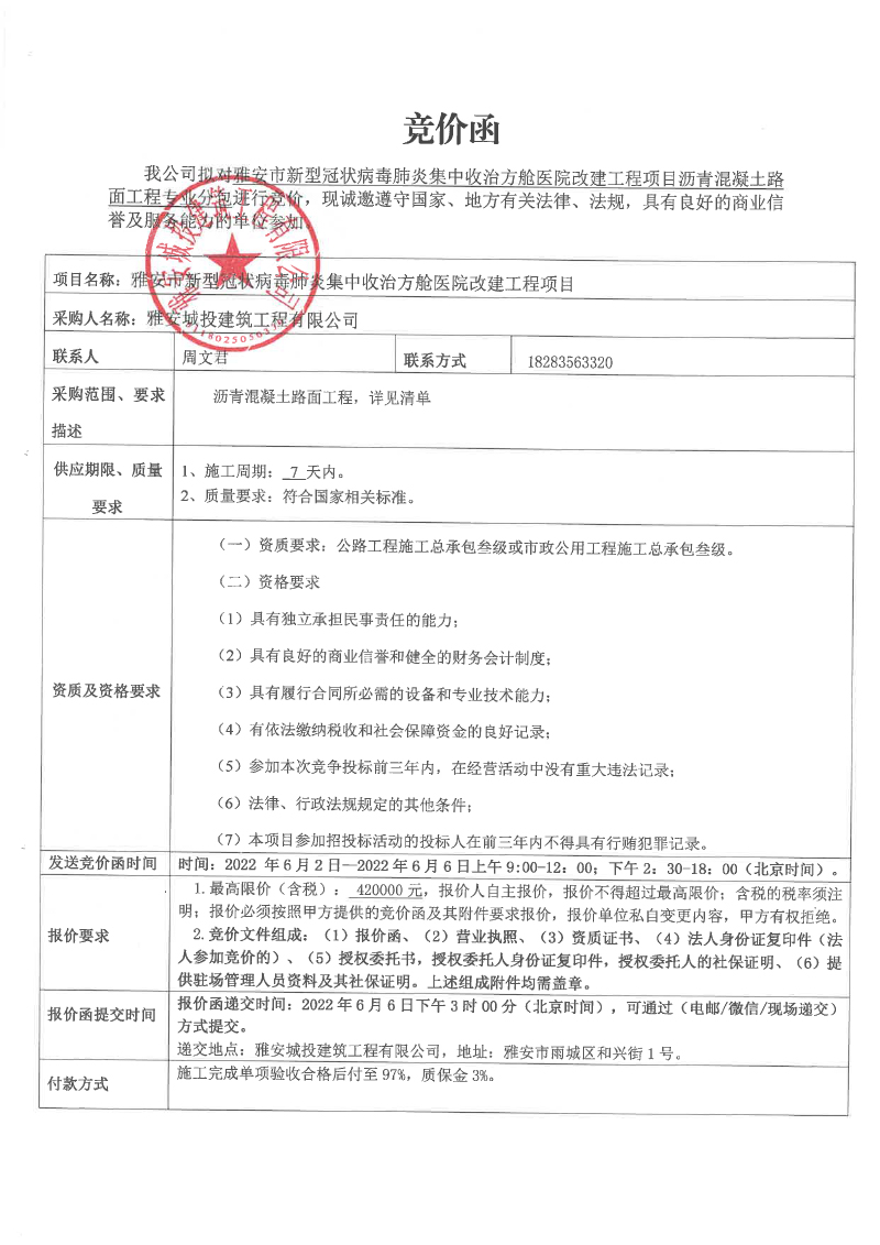 雅安市新型冠狀病毒肺炎集中收治方艙醫(yī)院改建工程項(xiàng)目瀝青混凝土路面工程專業(yè)分包競價(jià)函