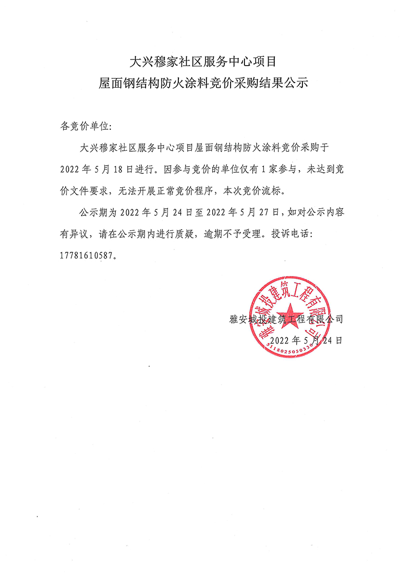 大興穆家社區(qū)服務(wù)中心項(xiàng)目屋頂鋼結(jié)構(gòu)防火涂料競(jìng)價(jià)采購(gòu)結(jié)果公示
