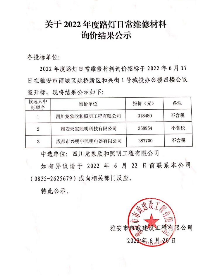 2022年路燈日常維修材料詢(xún)價(jià)結(jié)果公示