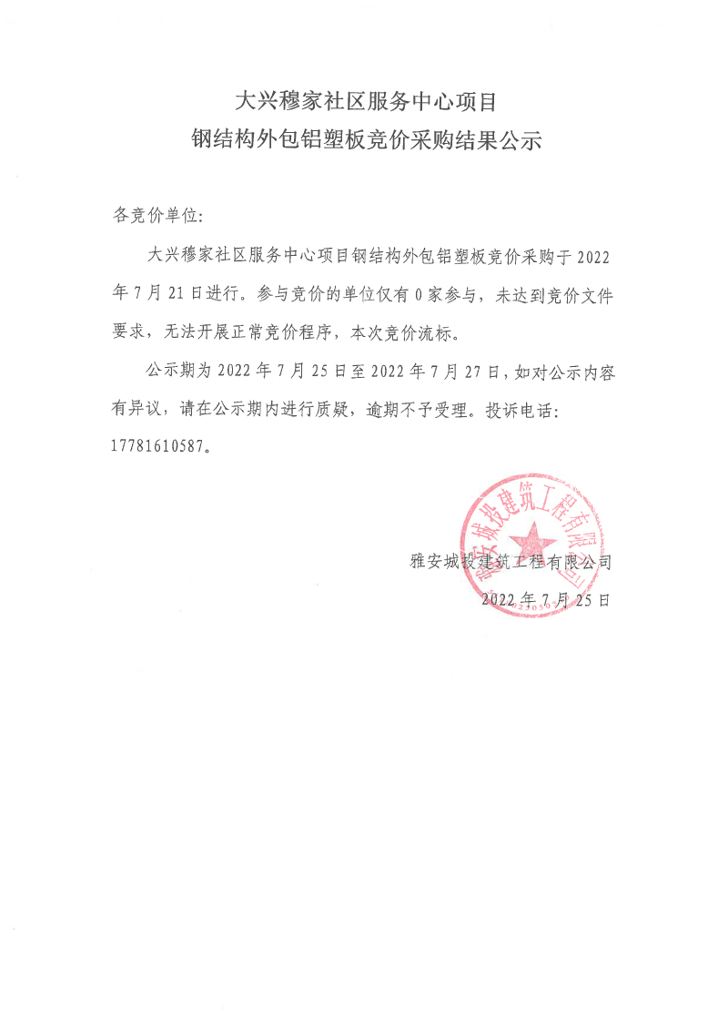 大興穆家社區(qū)服務(wù)中心項目鋼結(jié)構(gòu)外包鋁塑板競價采購結(jié)果公示
