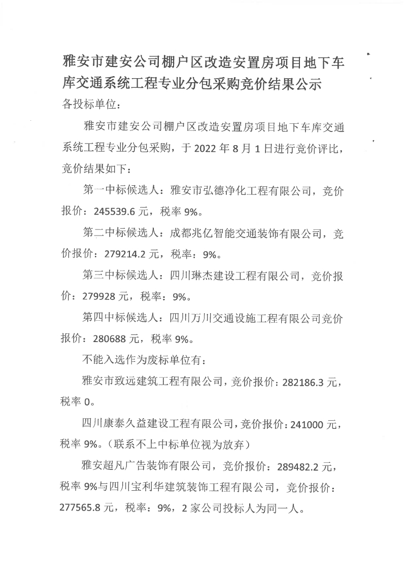 雅安市建安公司棚戶區(qū)改造安置房項目地下車庫交通系統(tǒng)工程專業(yè)分包競價結(jié)果公示