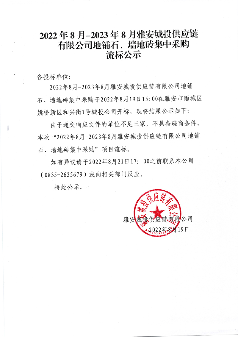 2022年8月-2023年8月雅安城投供應(yīng)鏈有限公司地鋪石、墻地磚集中采購(gòu)流標(biāo)公示