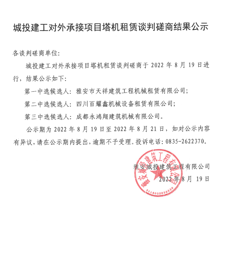 城投建工對(duì)外承接項(xiàng)目塔機(jī)租賃談判磋商結(jié)果公示