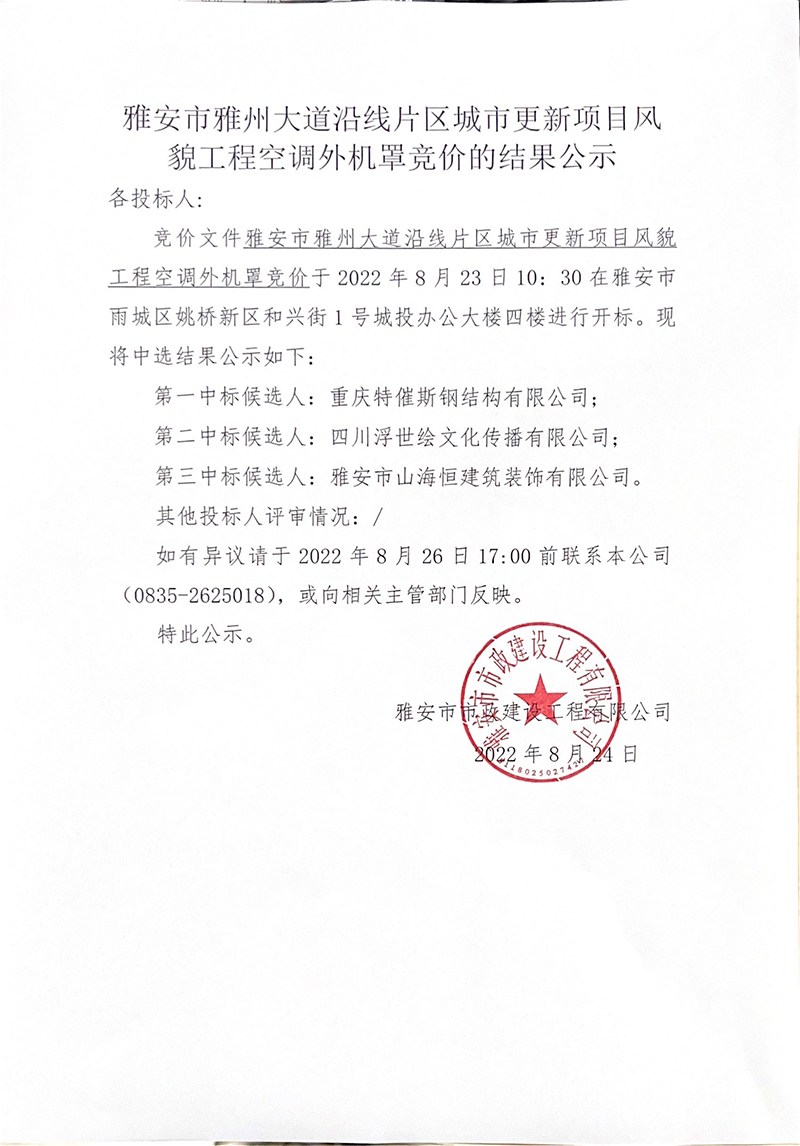 雅安市雅州大道沿線片區(qū)城市更新項(xiàng)目風(fēng)貌工程空調(diào)外機(jī)罩競(jìng)價(jià)的結(jié)果公示