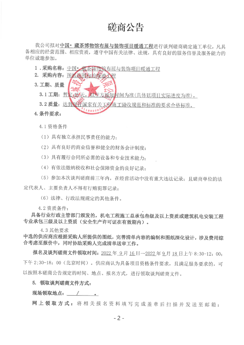 中國• 藏茶博物館布展與裝飾項目暖通工程談判磋商公告