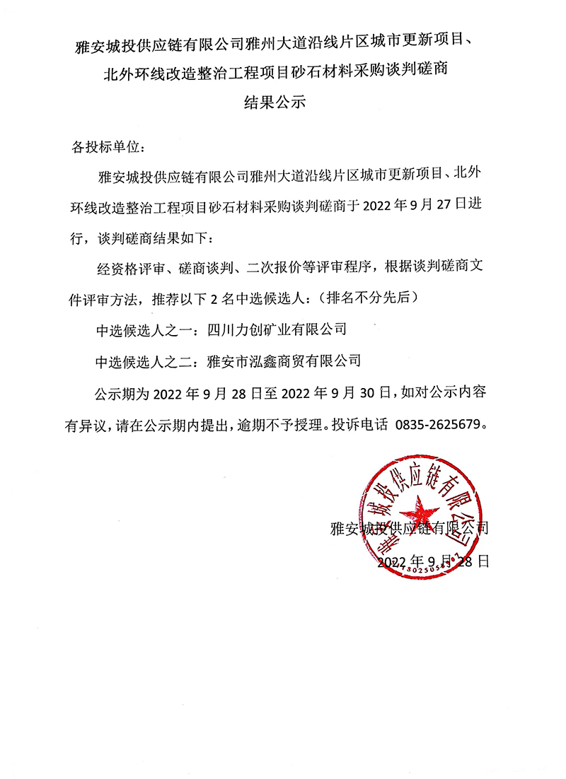 雅安城投供應(yīng)鏈有限公司雅州大道沿線片區(qū)城市更新項目砂石材料采購談判磋商結(jié)果公示