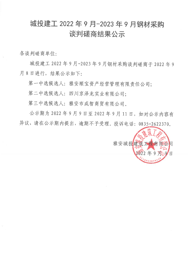 城投建工2022年9月-2023年9月鋼材采購談判磋商結果公示