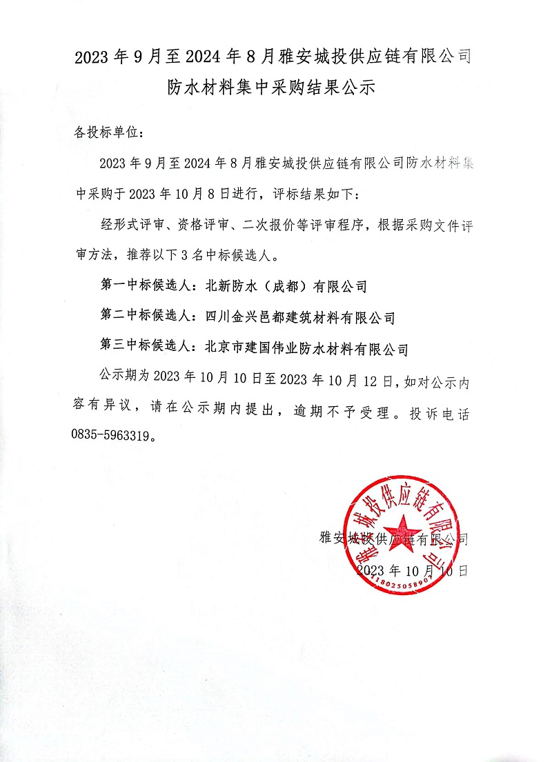 2023年9月至2024年8月雅安城投供應(yīng)鏈有限公司防水材料集中采購結(jié)果公示