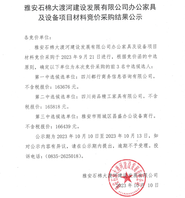雅安石棉大渡河建設(shè)發(fā)展有限公司辦公家具及設(shè)備項(xiàng)目材料競價(jià)采購結(jié)果公示