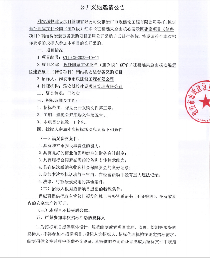 長(zhǎng)征國(guó)家文化公園(寶興段)紅軍長(zhǎng)征翻越夾金山核心展示區(qū)建設(shè)項(xiàng)目(儲(chǔ)備項(xiàng)目)鋼結(jié)構(gòu)安裝勞務(wù)采購項(xiàng)目公開采購邀請(qǐng)公告