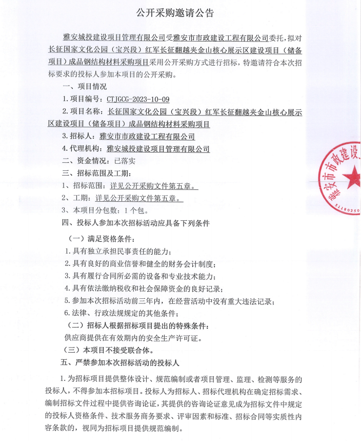 長征國家文化公園(寶興段)紅軍長征翻越夾金山核心展示區(qū)建設(shè)項目(儲備項目)成品鋼結(jié)構(gòu)材料采購項目公開采購邀請公告