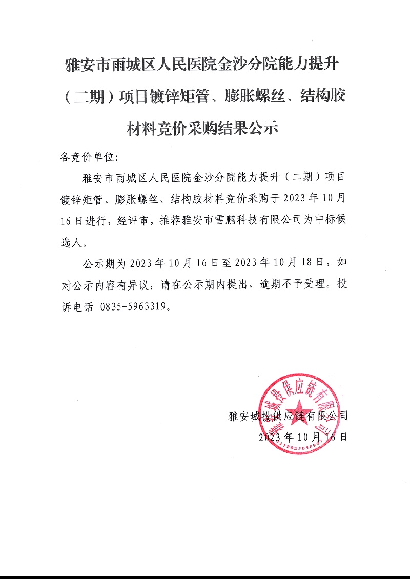 雅安市雨城區(qū)人民醫(yī)院金沙分院能力提升(二期)項目鍍鋅矩管、膨脹螺絲、結(jié)構(gòu)膠材料競價采購結(jié)果公示