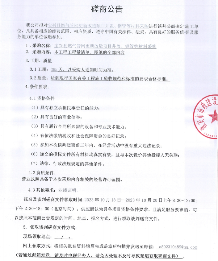 寶興縣燃?xì)夤芫W(wǎng)更新改造項(xiàng)目井蓋、鋼管等材料采購(gòu)談判磋商公告