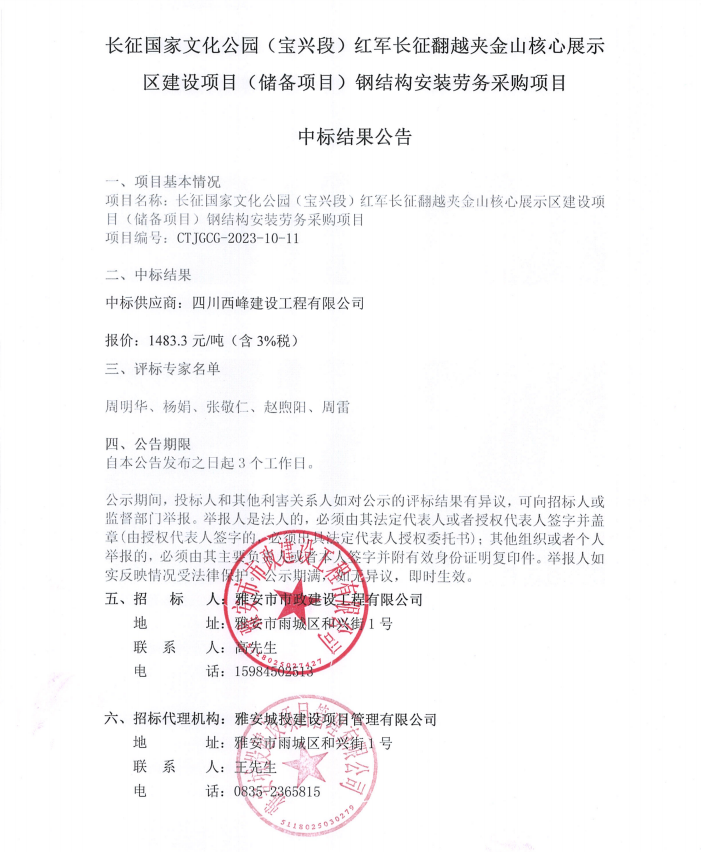 長(zhǎng)征國(guó)家文化公園(寶興段)紅軍長(zhǎng)征翻越夾金山核心展示區(qū)建設(shè)項(xiàng)目(儲(chǔ)備項(xiàng)目)鋼結(jié)構(gòu)安裝勞務(wù)采購(gòu)項(xiàng)目中標(biāo)結(jié)果公告