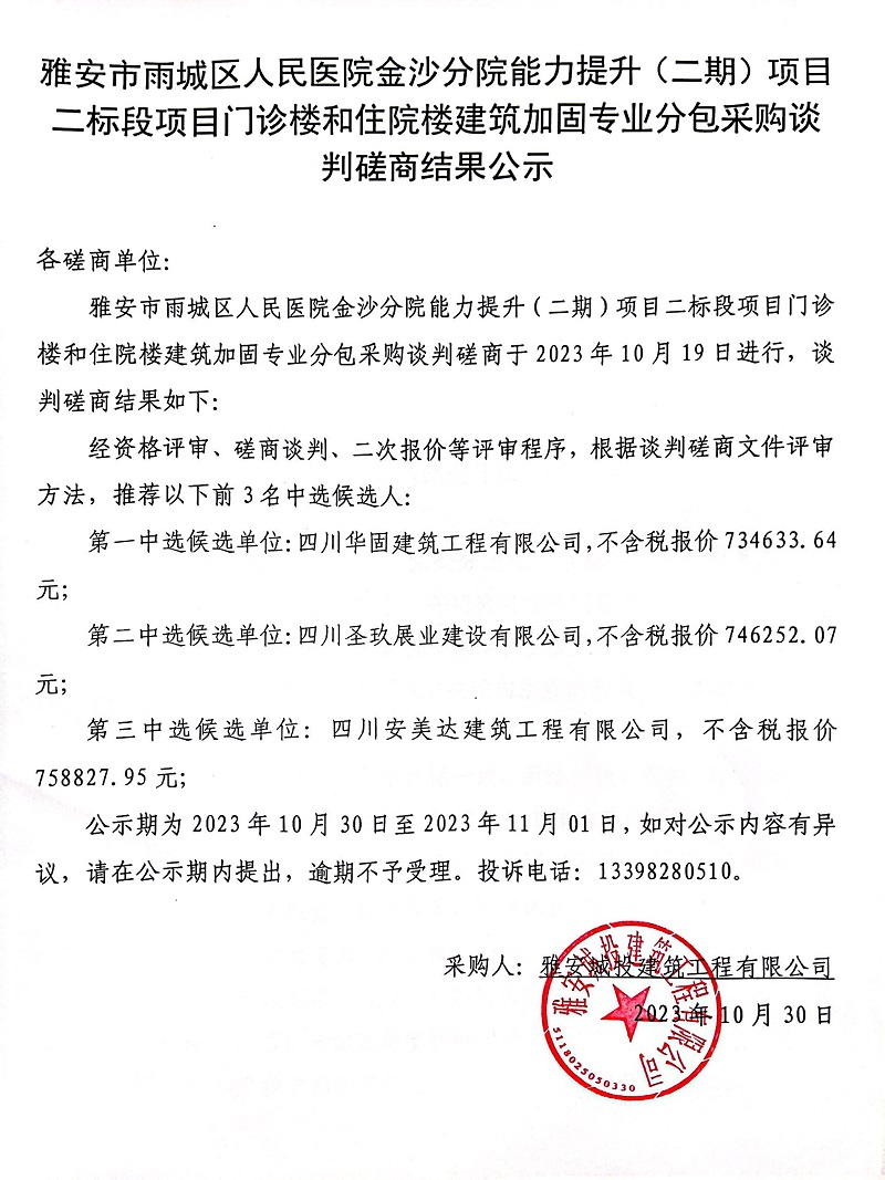 雅安市雨城區(qū)人民醫(yī)院金沙分院能力提升(二期)項(xiàng)目二標(biāo)段門診樓和住院樓建筑加固專業(yè)分包采購(gòu)談判磋商結(jié)果公示