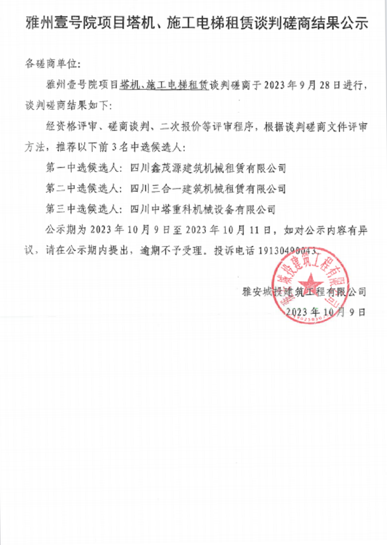 雅州壹號院項(xiàng)目塔機(jī)、施工電梯租賃談判磋商結(jié)果公示