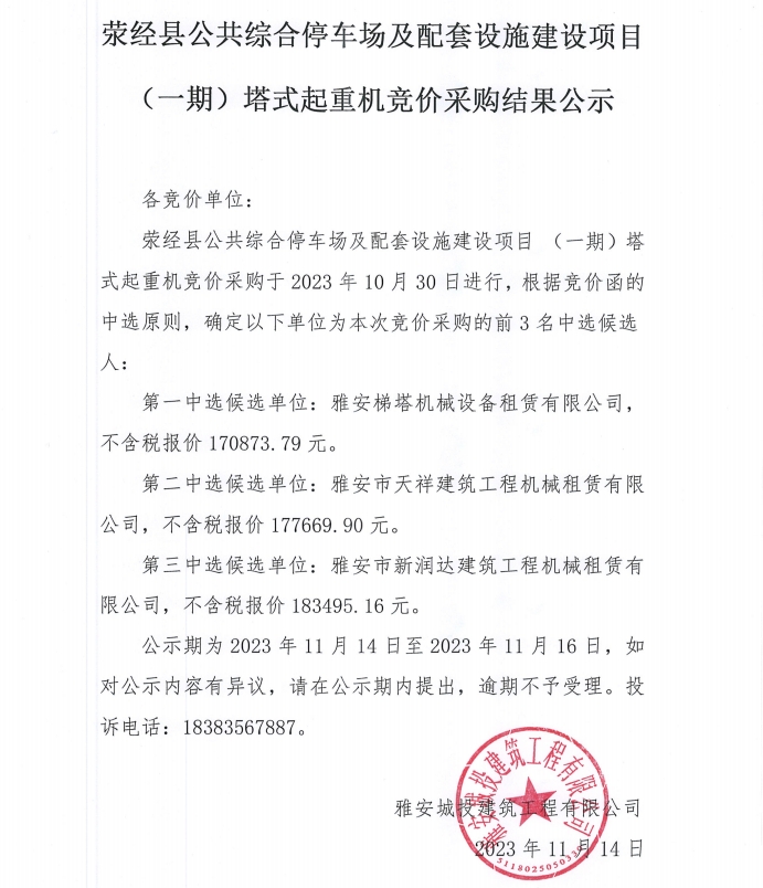 滎經(jīng)縣公共綜合停車場及配套設(shè)施建設(shè)項目(一期)塔式起重機競價采購結(jié)果公示