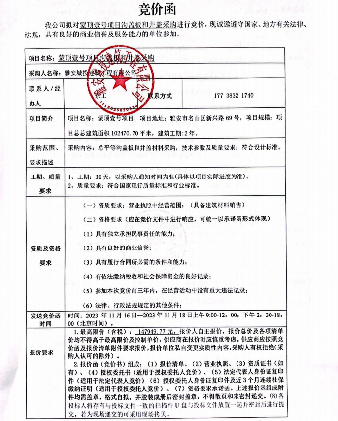 蒙頂壹號(hào)項(xiàng)目溝蓋板和井蓋采購競(jìng)價(jià)公告