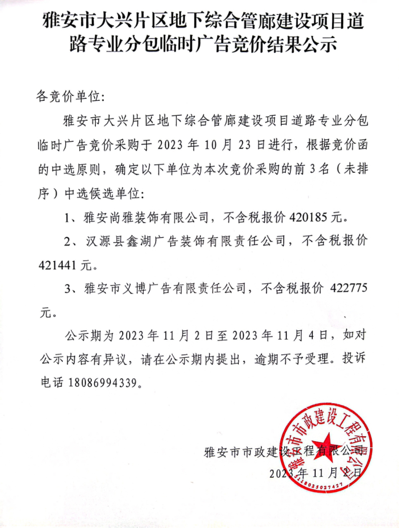 雅安市大興片區(qū)地下綜合管廊建設項目道路專業(yè)分包臨時廣告競價結果公示
