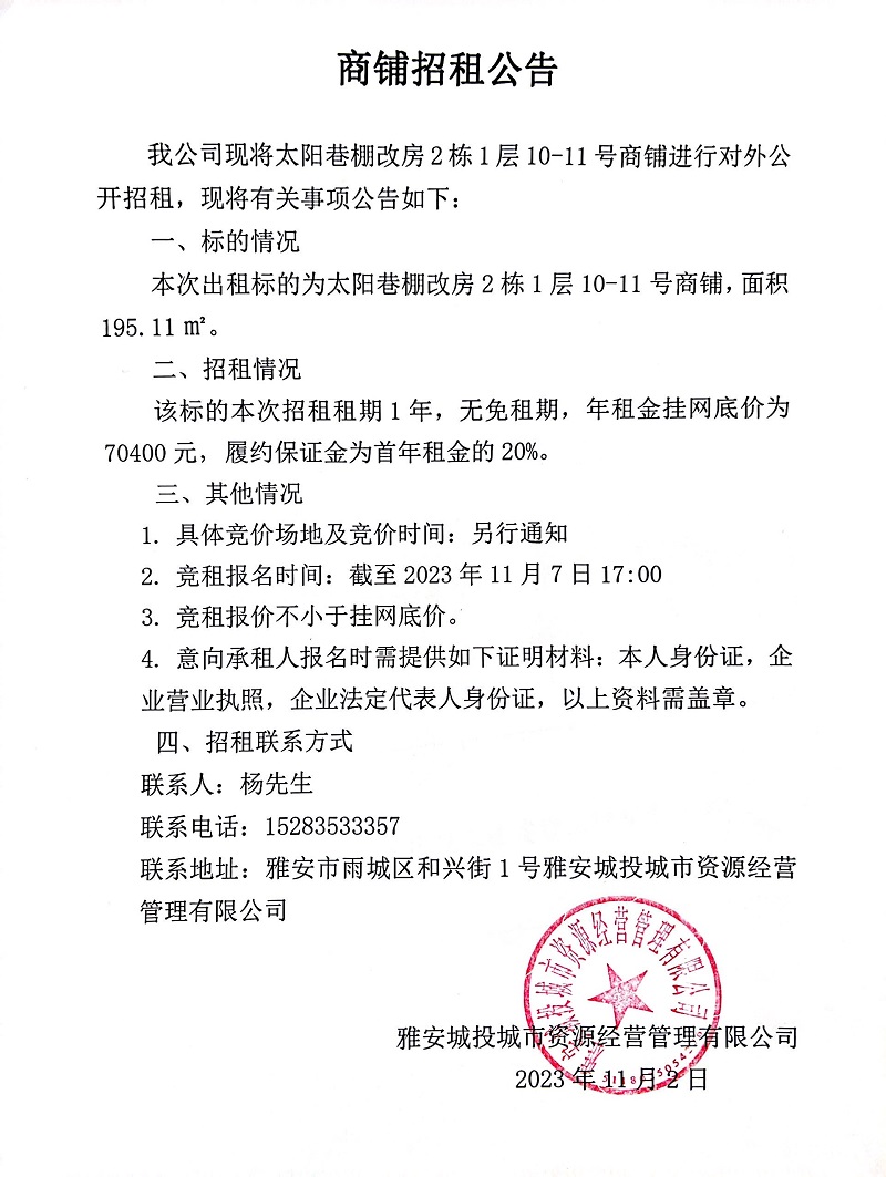 太陽巷棚改房2棟1層10-11號商鋪招租公告