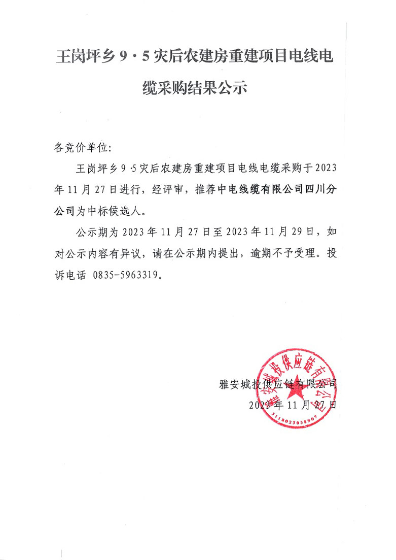 王崗坪鄉(xiāng)9·5災后農建房重建項目電線電纜采購結果公示