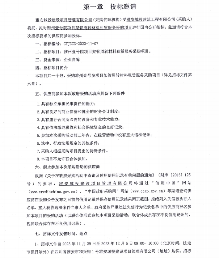 雅州壹號(hào)院項(xiàng)目架管周轉(zhuǎn)材料租賃服務(wù)采購(gòu)項(xiàng)目投標(biāo)邀請(qǐng)公告
