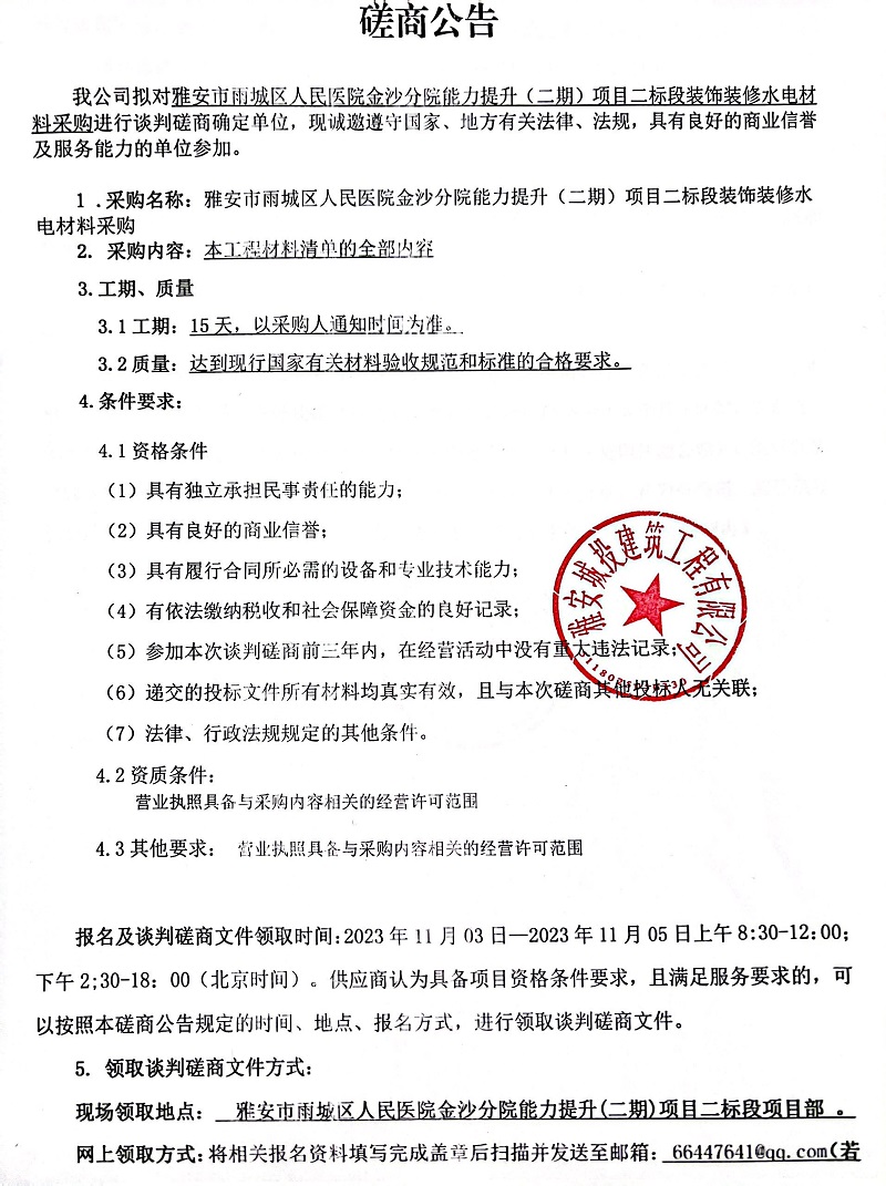 雅安市雨城區(qū)人民醫(yī)院金沙分院能力提升(二期)項目二標段裝飾裝修水電材料采購談判磋商公告