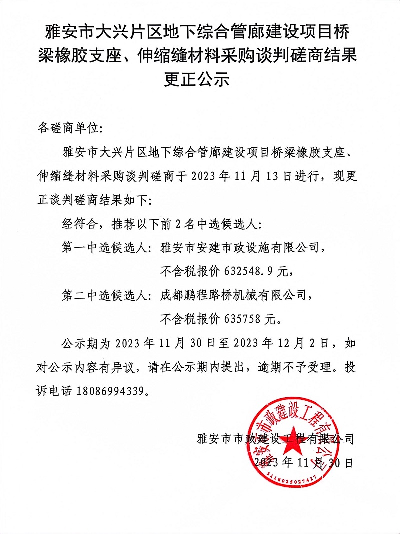 雅安市大興片區(qū)地下綜合管廊建設(shè)項(xiàng)目橋梁橡膠支座、伸縮縫材料采購(gòu)談判磋商結(jié)果更正公示