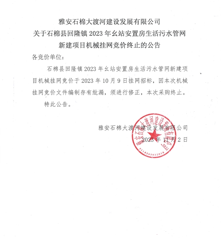 雅安石棉大渡河建設(shè)發(fā)展有限公司關(guān)于石棉縣回隆鎮(zhèn)2023年幺站安置房生活污水管網(wǎng)新建項目機(jī)械掛網(wǎng)競價終止的公告