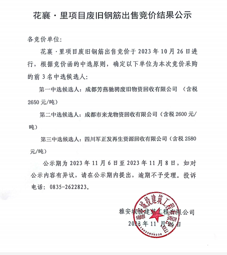花襄·里廢舊鋼筋出售競價結果公示