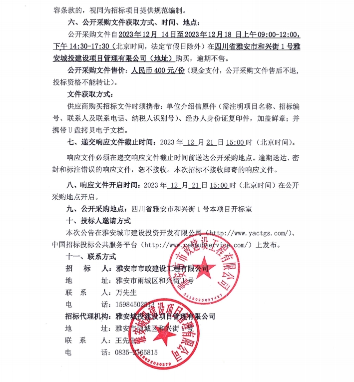 雅安市大興片區(qū)地下綜合管廊建設(shè)項目路燈和交安分包工程成品材料采購項目公開采購邀請公告