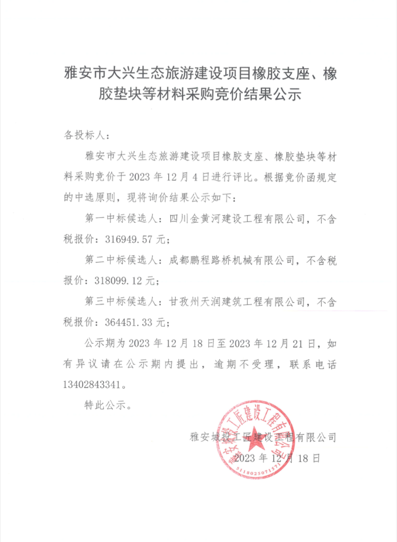 雅安市大興生態(tài)旅游建設(shè)項(xiàng)目橡膠支座、橡膠墊塊等材料采購競價(jià)結(jié)果公示