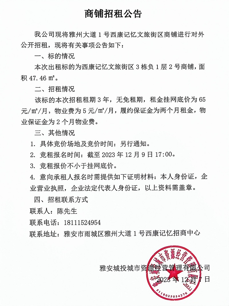 雅州大道1號(hào)西康記憶文旅街區(qū)3棟負(fù)1層2號(hào)商鋪招租公告