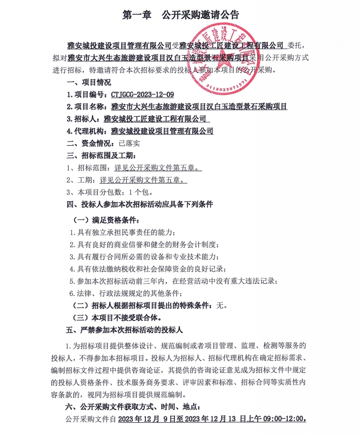 雅安市大興生態(tài)旅游建設(shè)項(xiàng)目漢白玉造型景石采購(gòu)項(xiàng)目公開采購(gòu)邀請(qǐng)公告