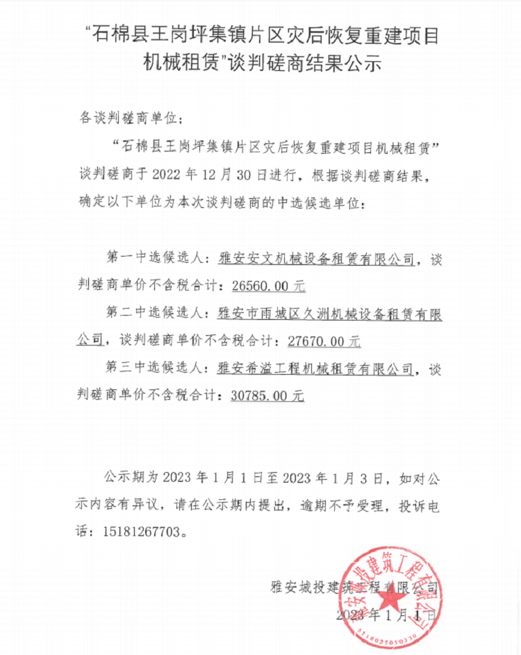 “石棉縣王崗坪集鎮(zhèn)片區(qū)災(zāi)后恢復(fù)重建項(xiàng)目機(jī)械租賃”談判磋商結(jié)果公示