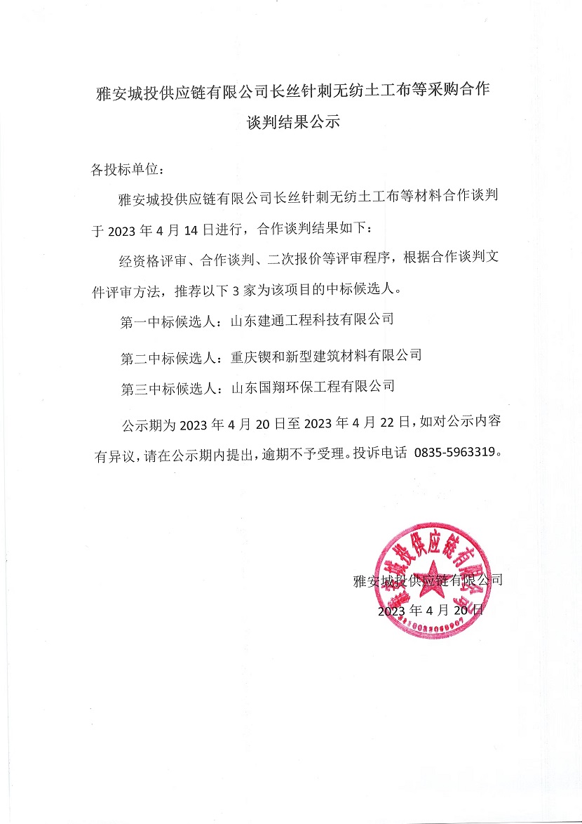 雅安城投供應鏈有限公司長絲針刺無紡土工布等采購合作談判結果公示
