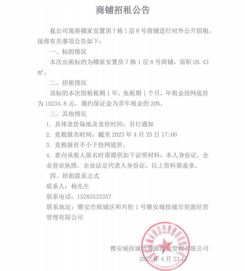穆家安置房7棟1層8號(hào)商鋪招租公告