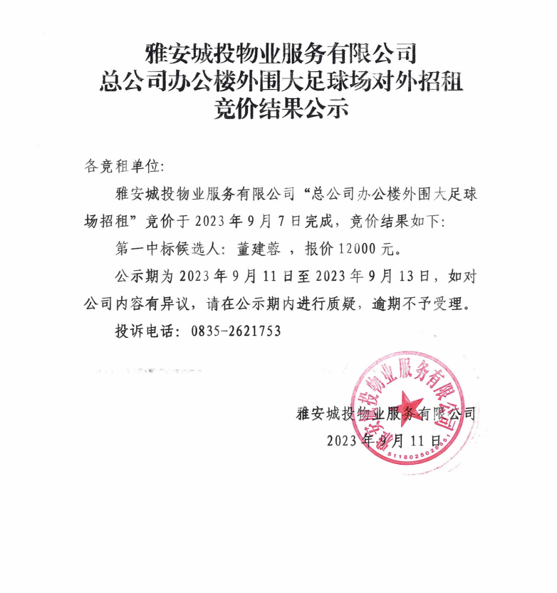 雅安城投物業(yè)服務有限公司總公司辦公樓外圍大足球場對外招租競價結(jié)果公示